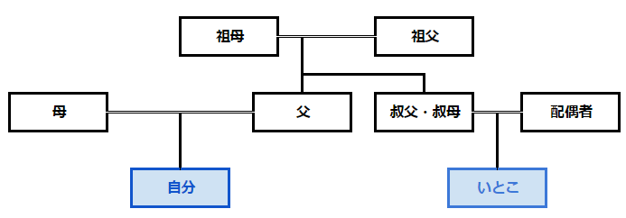 「いとこ」とは漢字で「従兄弟姉妹」と書き、「父母の兄弟姉妹の子」の続柄です。