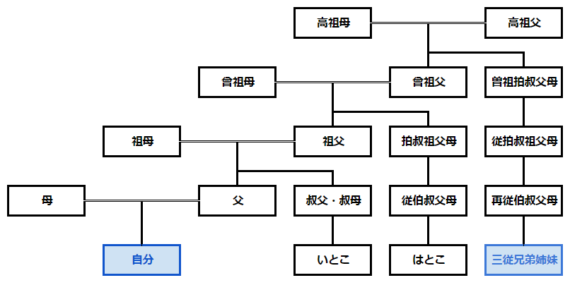 家系図上で自分から「みいとこ」を辿ってみると、「自分→父母→祖父母→曾祖父母→高祖父母→曾祖伯叔父母→従伯叔祖父母→再従伯叔父母→三従兄弟姉妹」と8親等離れていることがわかりますね。