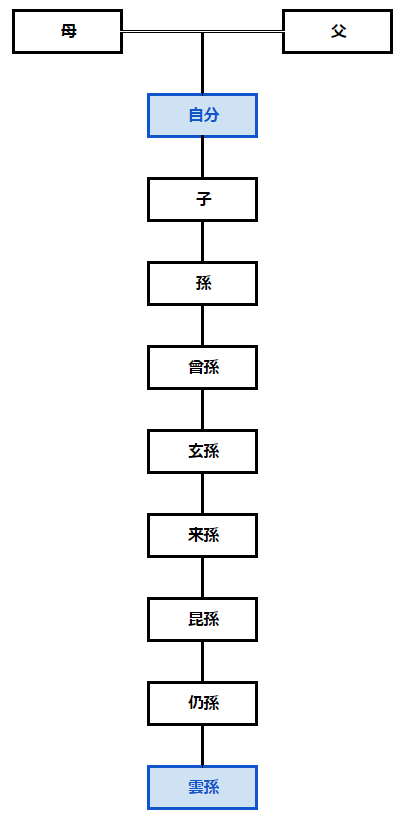 家系図上で自分から「雲孫」を辿ってみると、「自分→子→孫→曾孫→玄孫→来孫→昆孫→仍孫→雲孫」と8親等離れていることがわかりますね。