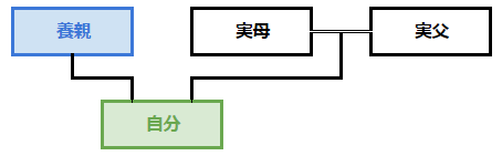 家系図上で自分から「養親」を辿ってみると、「自分→養親」と1親等離れていることがわかりますね。